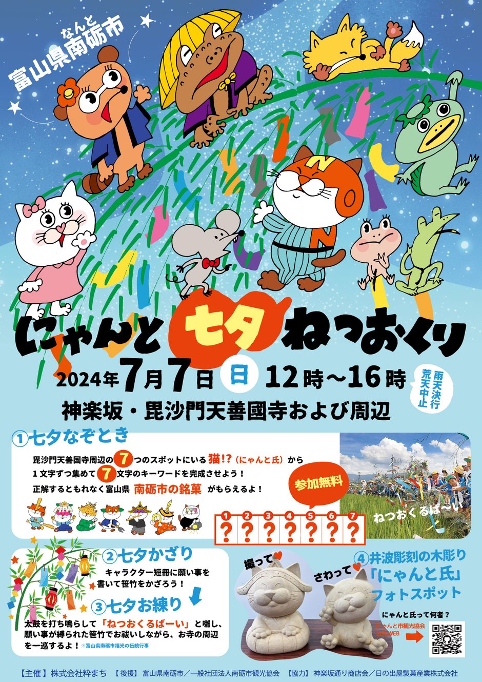 今回は、神楽坂化け猫フェスティバルとのコラボとして、富山県南砺市の伝統行事「ねつおくり」をアレンジして再現。南砺市公認の地域おこし協力猫「にゃんと氏」と一緒に、商売繁盛や疫病退散、五穀豊穣などを願って神楽坂を練り歩きましょう。願い事を短冊に書いて笹に飾る七夕かざりや、南砺市にちなんだキーワードを集めると銘菓がもらえる「なぞときラリー」も楽しめます。神楽坂で南砺市の魅力をたっぷりと知ることができるイベントです。