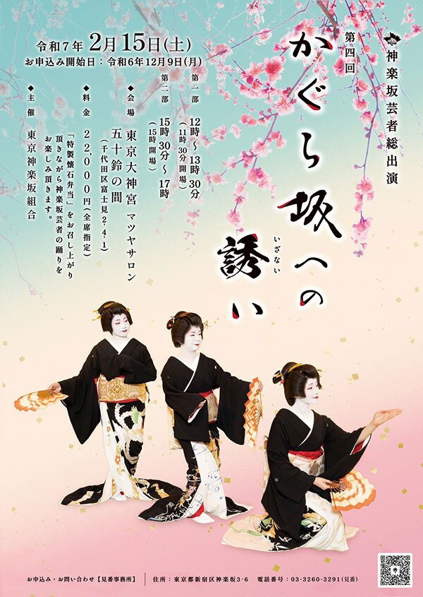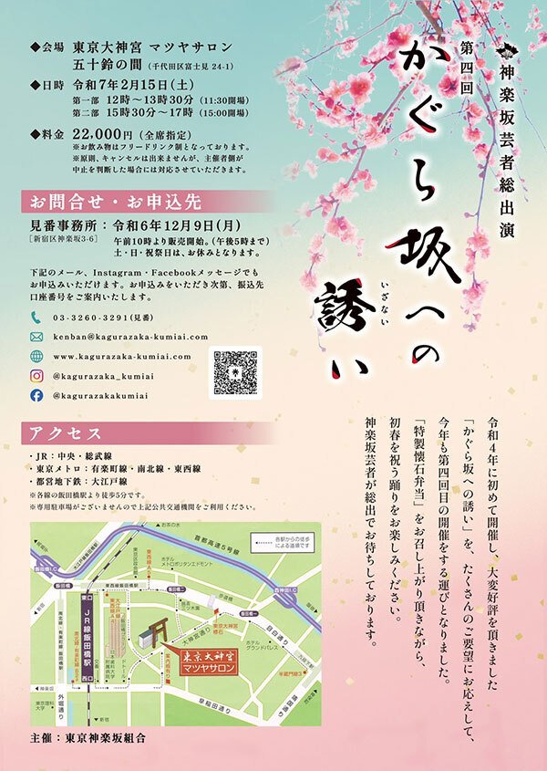 | 문의 | ◆見番事務所窓口 (平日10時〜17時) ◆見番事務所電話 (03-3260-3291) ◆Eメール kenban@kagurazaka-kumiai.com |