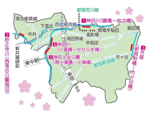 | 장소 | [1]神田川、[2]妙正寺川、[3]外濠、[4]神田川、[5]神田上水公園 |