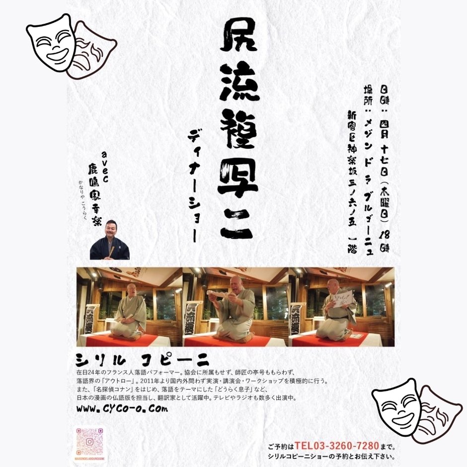 こちらで4月17日に、フランス人落語パフォーマーの尻流複写二(シリル コピー二)によるディナーショーが行われます。