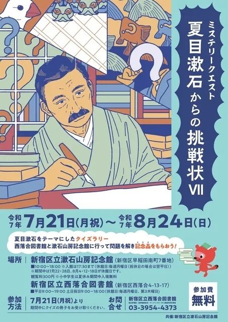 | 참가비 | 【西落合図書館】 無料 【漱石山房記念館】 一般300円、小中学生100円 ※小中学生は土日祝日および夏季休業日(7/21~8/24)は無料 |