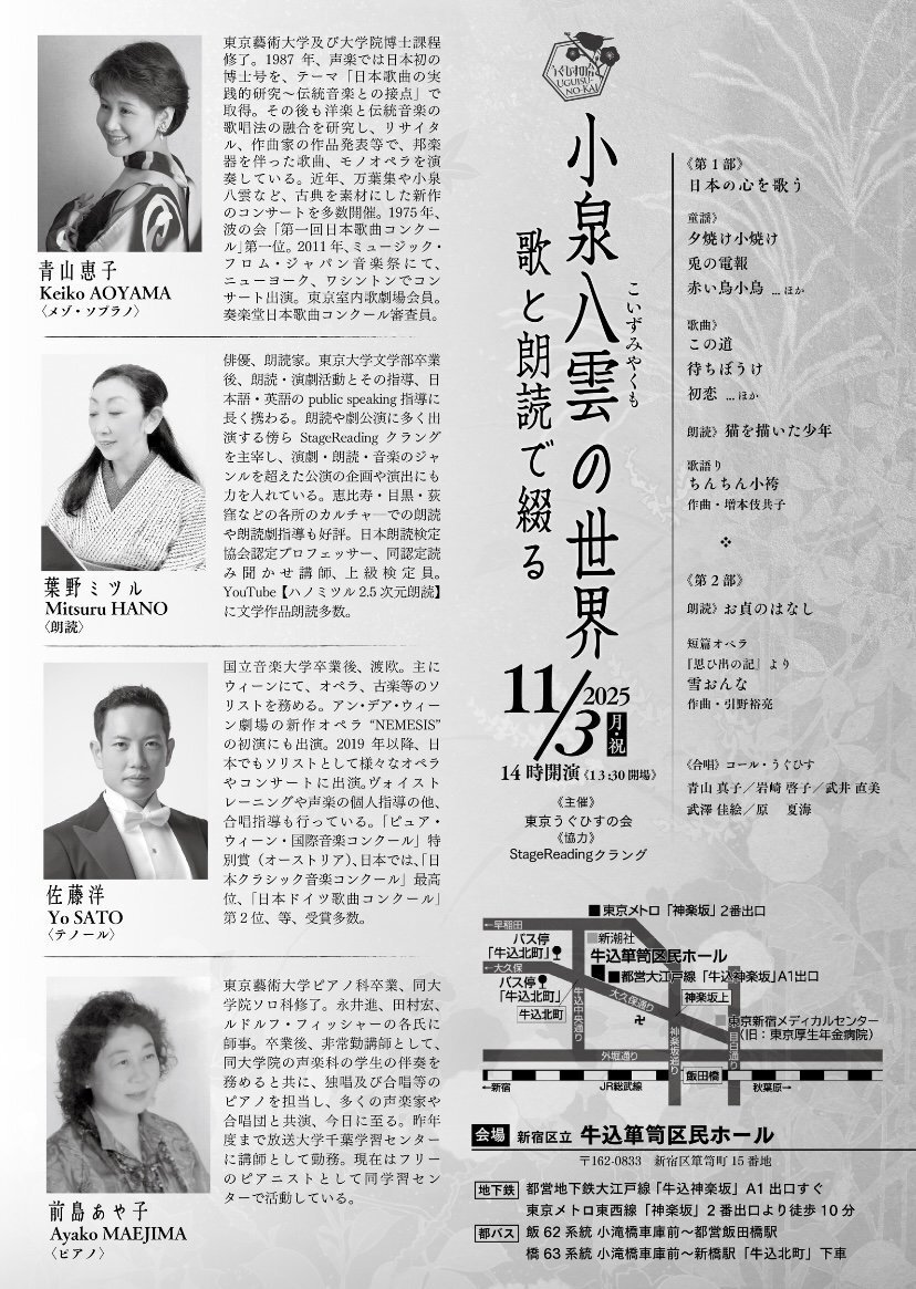 出雲出身のメゾ・ソプラノ歌手・青山恵子の委嘱作品で他では聴けない短編オペラ「雪女」「ちんちん小袴」や、俳優・朗読家の葉野ミツルによる朗読「猫を描いた少年」「お貞のはなし」など、八雲文学の魅力をたっぷりと味わえるプログラムです。