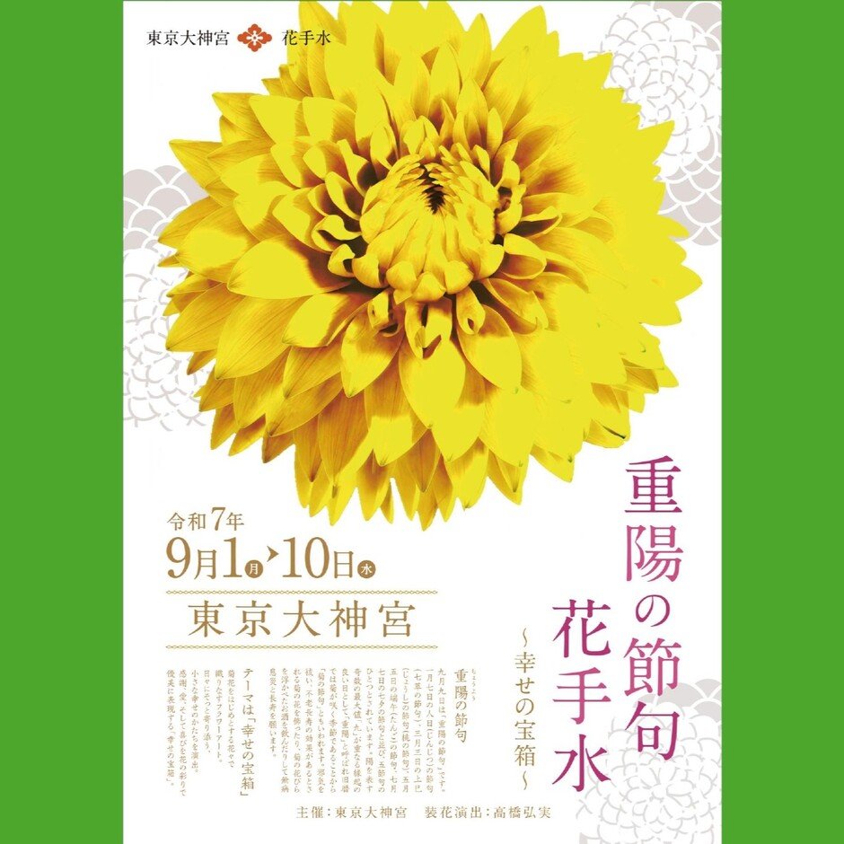 9月9日の「重陽の節句」にあわせて、9月1日から花手水がはじまります。重陽の節句は、縁起のよい奇数の中でも最大数「9」が重なることから、古くから長寿や幸福を願う大切な日とされてきました。