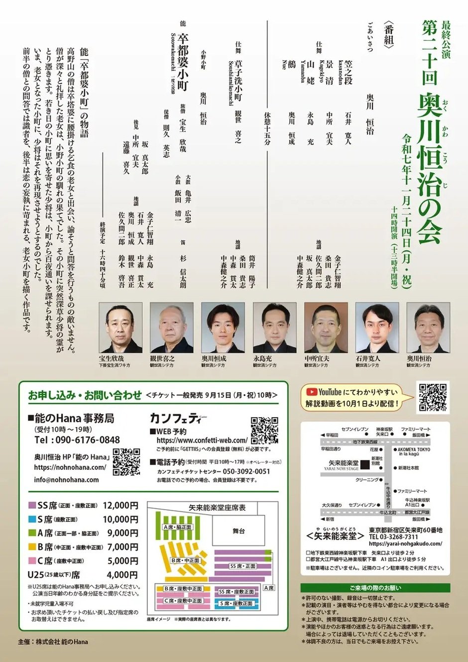 | 문의 | 矢来能楽堂 〒162-0805 東京都新宿区矢来町60 TEL 03-3268-7311 不定休、お問い合わせ対応時間 10:00 ~ 17:00 |