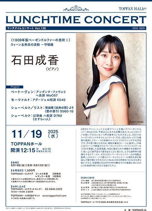 〈ランチタイムコンサート Vol.136〉〈1909年製ベーゼンドルファーの息吹 I〉 石田成香(ピアノ)