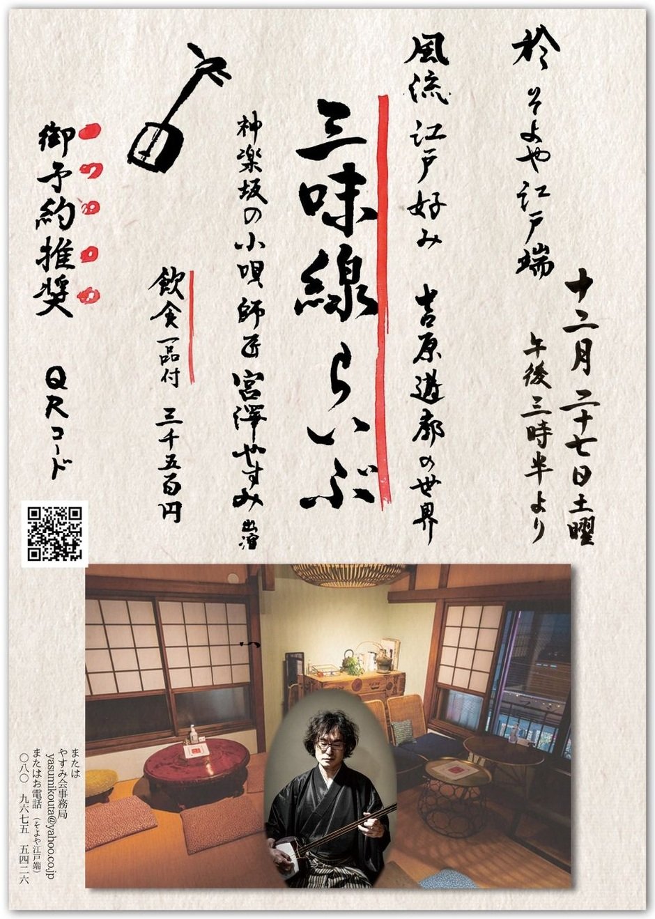「大河ドラマ「べらぼう」で注目の江戸文化。小唄の世界を話に仕立て、セリフを交えて歌います。飲食付いての三味線ライブ。お茶もよしお酒もよし。飲んだり食べたりしゃべったり。クリスマスの狂騒を終えて年越しを控える土曜です。終演後もゆっくり飲んでって。僕もいるんで。ご予約まってます」