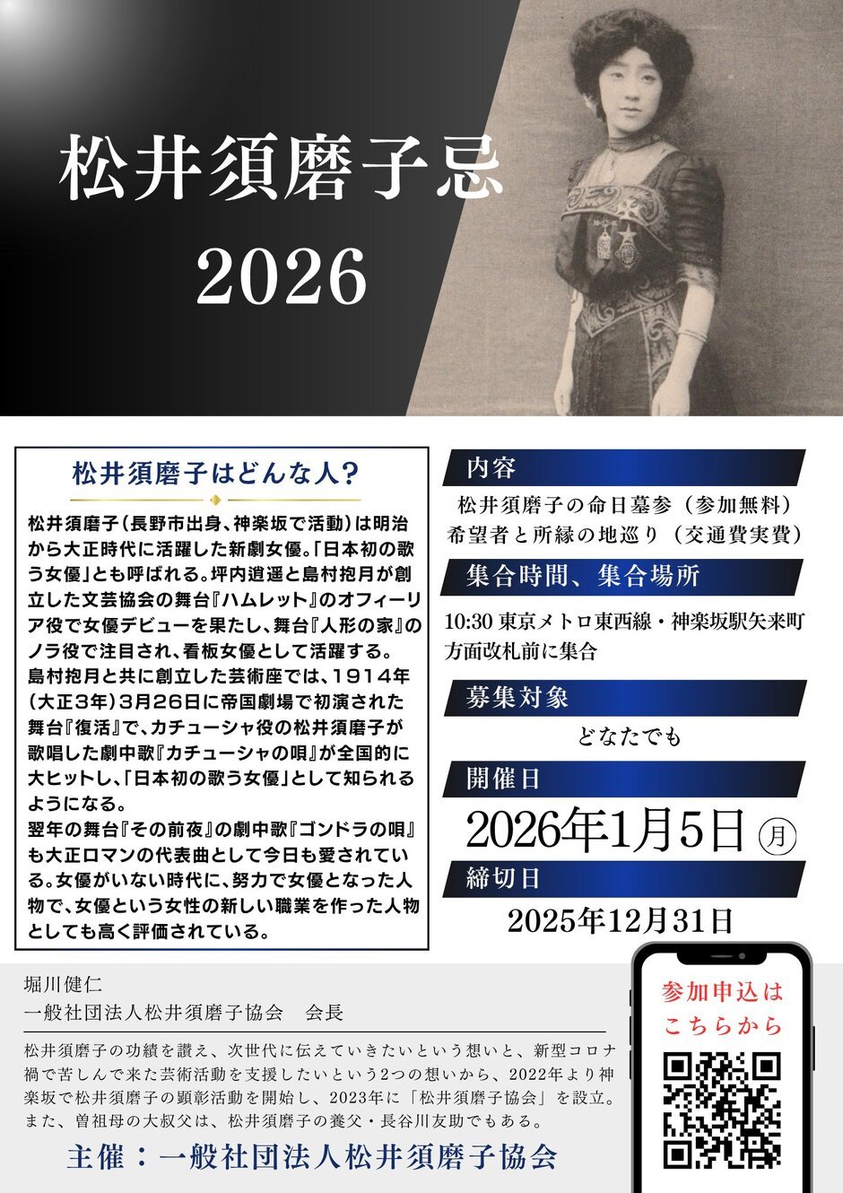 松井須磨子の功績を讃え、次代へ伝えていきたいという想いと、新型コロナ禍で苦しんできた芸術活動を支援したいという2つの想いから、2022年より神楽坂で松井須磨子の顕彰活動を開始し、2023年に「松井須磨子協会」を設立。