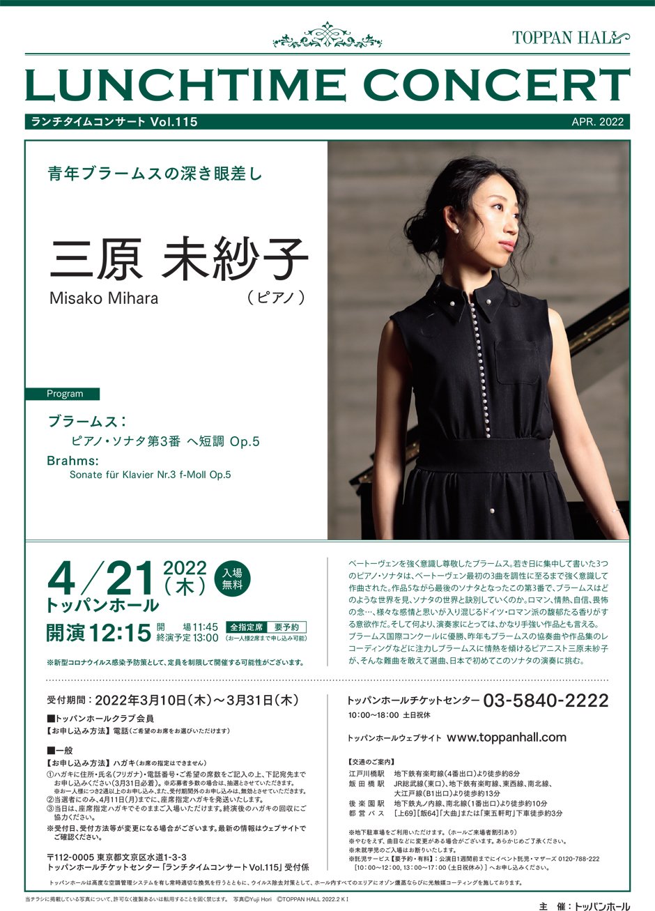 〈ランチタイムコンサート Vol.115〉三原未紗子(ピアノ)【入場無料/受付終了】