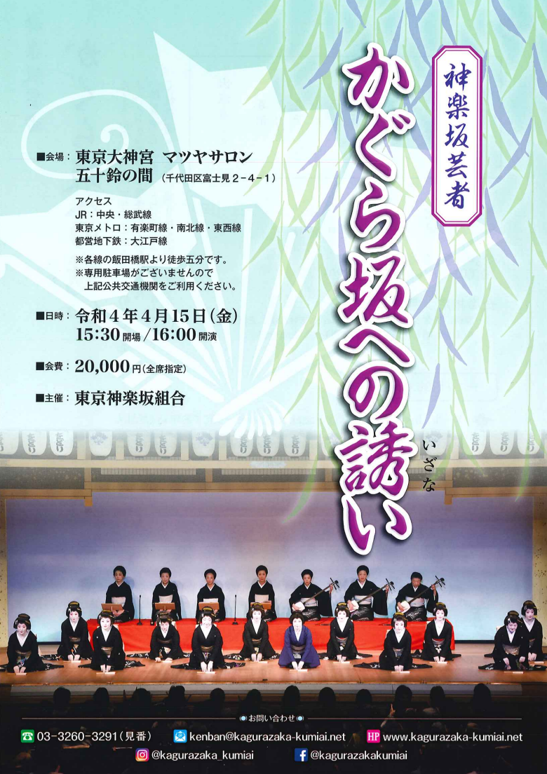 | 문의 | 東京神楽坂組合 お問い合わせ:☎03-3260-3291(見番) メール:kenban@kagurazaka-kumiai.net |