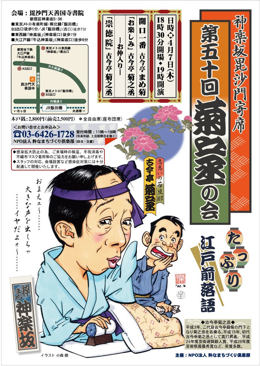 | 장소 | 神楽坂 毘沙門天 善国寺書院 (神楽坂5-36) JR飯田橋駅、西口 徒歩10分 有楽町線飯田橋駅 B3出口 徒歩5分 東西線神楽坂駅(神楽坂口) 徒歩7分 大江戸線牛込神楽坂駅 A3出口 徒歩6分 |