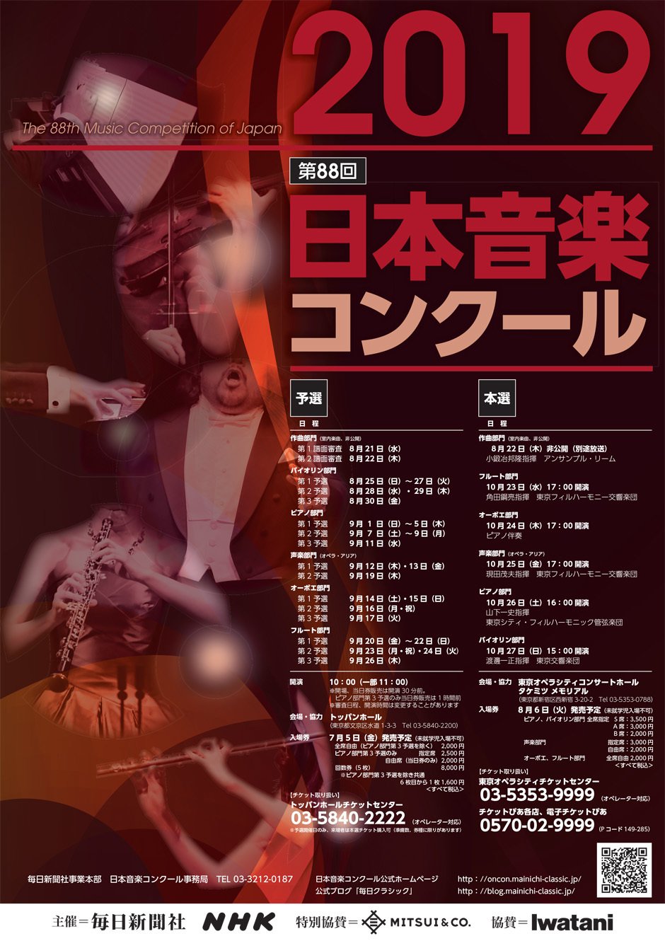 | 문의 | お問い合わせ: 日本音楽コンクール事務局 03-3212-0187 予選開催日事務局 03-3817-0152 チケットのお申込み: トッパンホールチケットセンター 03-5840-2222 |