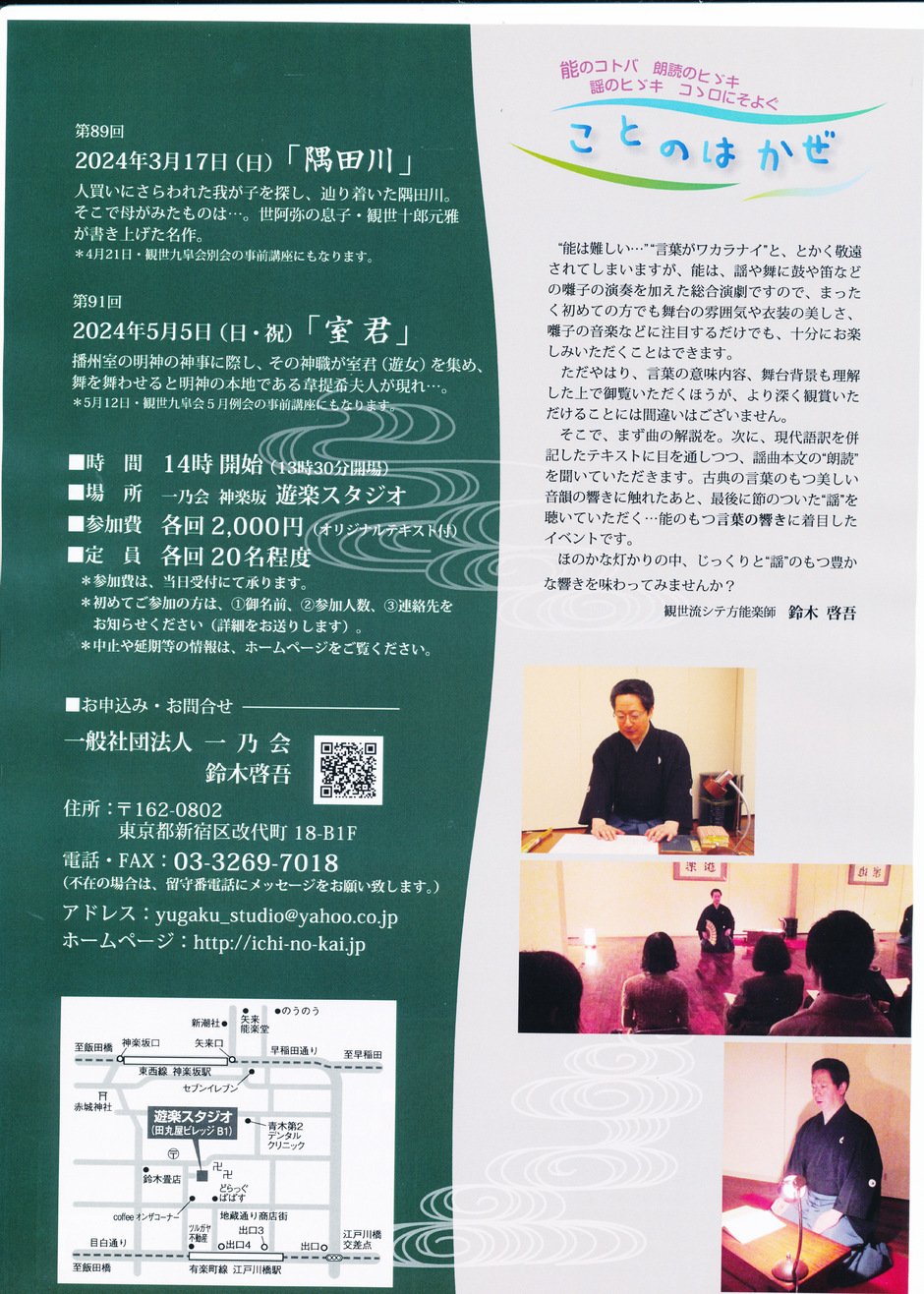 5月12日観世九皐会5月例会「室君」公演の事前講座に最適。