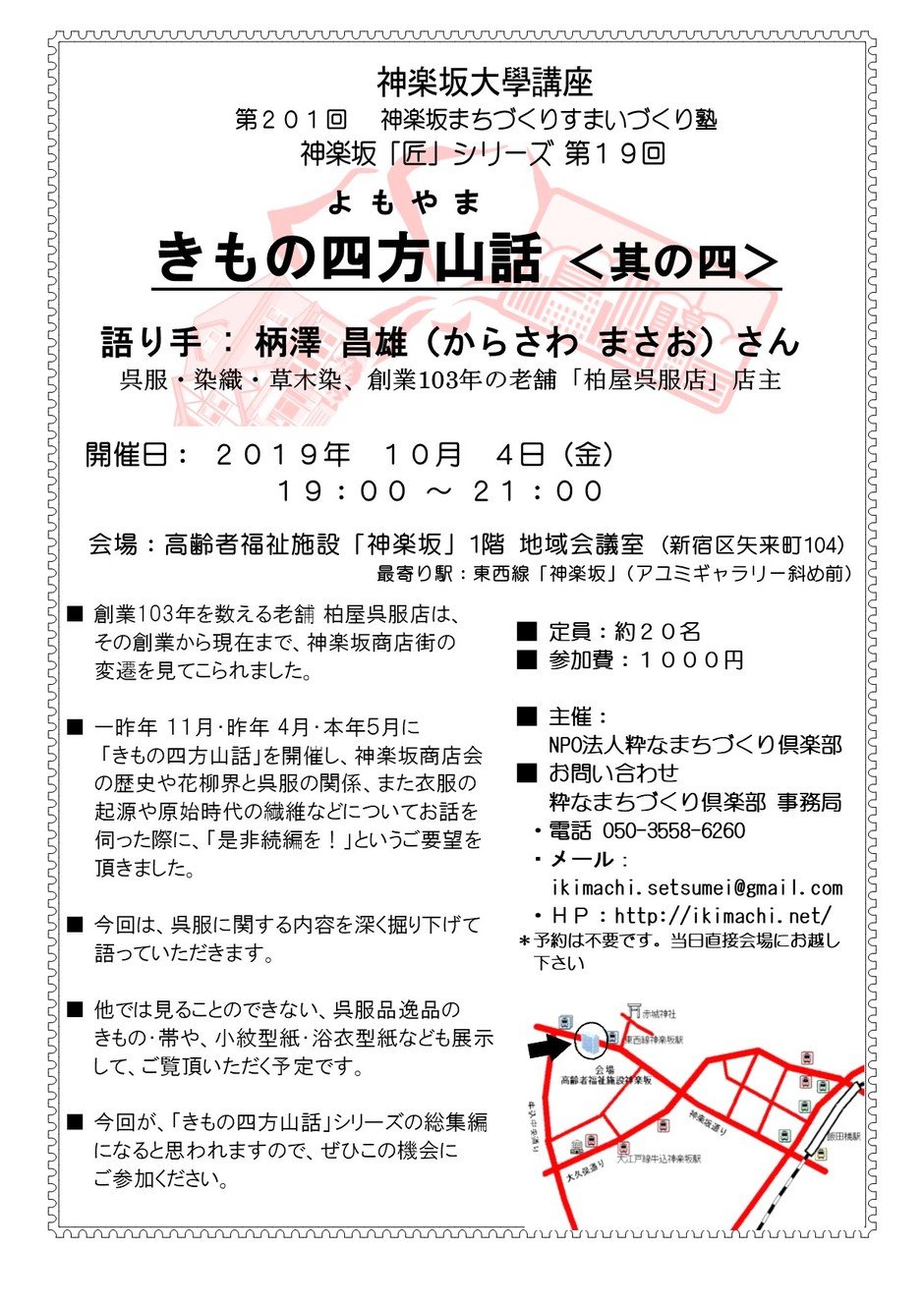 | 문의 | NPO法人「粋なまちづくり倶楽部」塾事務局 ・電話 :050-3558-6260 ・メール:ikimachi.setsumei@gmail.com |