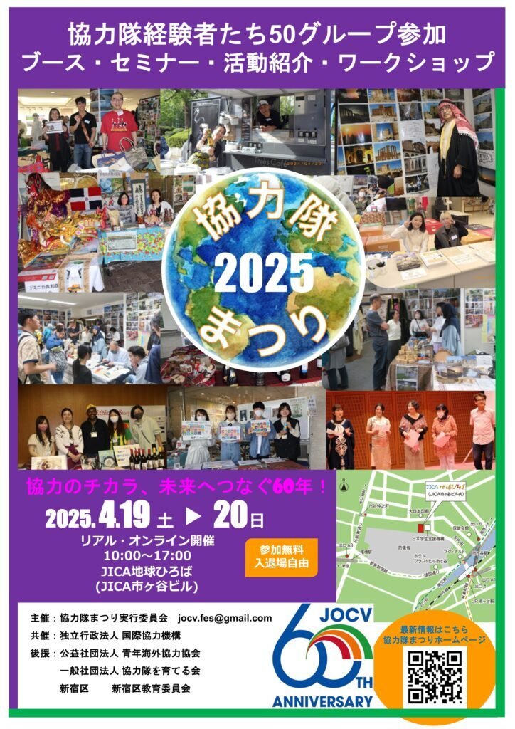 2025年で60周年を迎えるJICA海外協力隊の経験者が一堂に会し、その活動を紹介する年に一度の祭典です。多彩なブースやワークショップ、講演会を通じて、世界での経験を共有し、未来への新たな一歩を考える場を提供します。JICA海外協力隊や国際交流、国際協力、多文化共生、SDGsに関心のある方のご来場をお待ちしています。