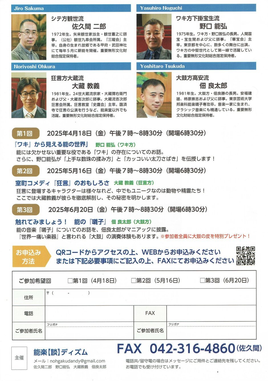 | 문의 | 主催:能楽【談】ディズム メール:nohgakudandy@gmail.com 佐久間二郎、野口能弘、大藏教義、佃良太郎 FAX:042-316-4860(佐久間) |