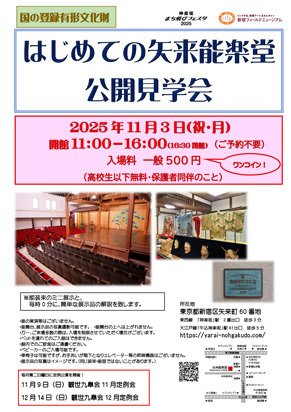 毎年恒例となりました国の登録有形文化財「矢来能楽堂」の公開見学会です。当日は装束や能面のミニ展示、毎時0分に能楽についての解説も行います。公開時間内は自由に出入りいただけます。