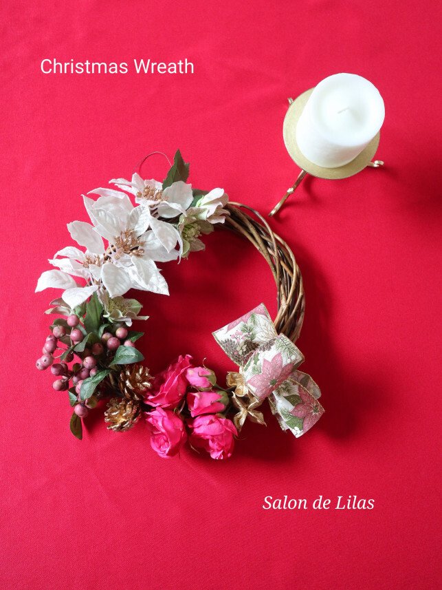 今年のクリスマスレッスンはピンク&ホワイトを基調としたアーティフィシャルフラワーのクリスマスリースを製作致します。